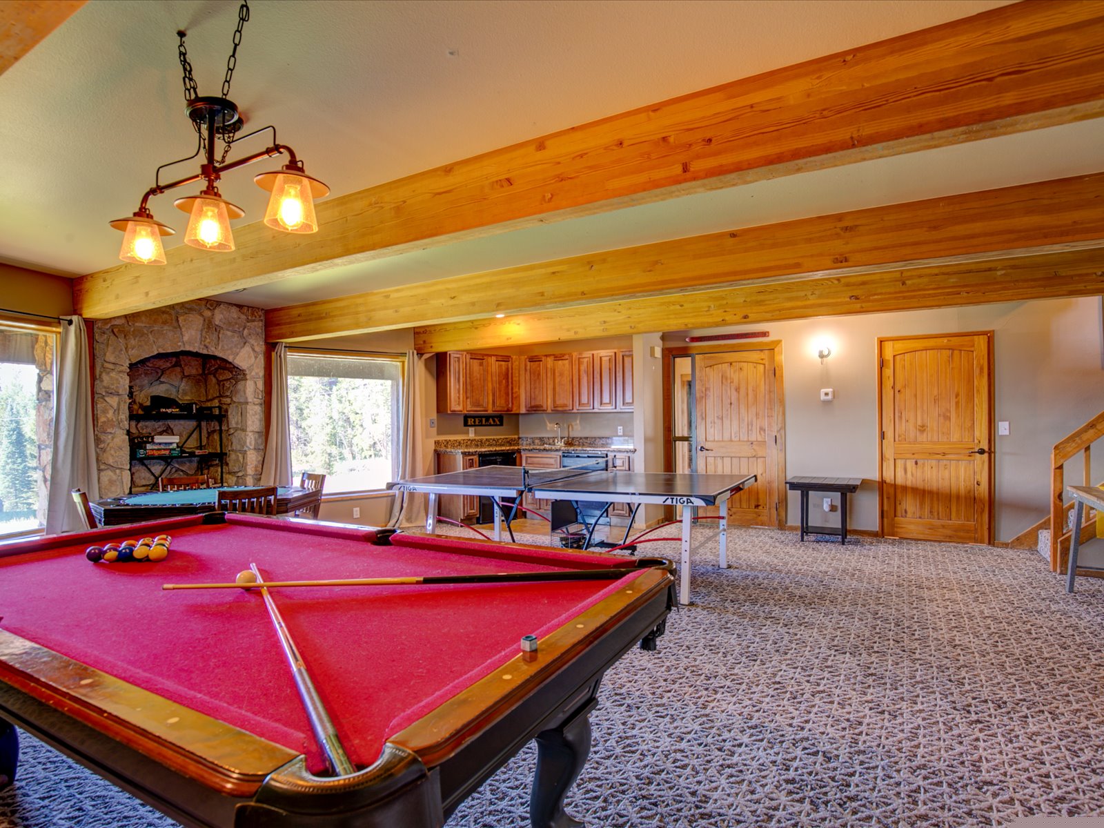 From the expansive decks of this great property, enjoy views of Lake Dillon and mountain peaks by day and the lights of night skiing at the Keystone Ski Resort by night. The 5100 square foot home boasts seven bedrooms, three of which are masters, two more have queen beds, and there are two bunkrooms with a total of ten beds for the kids. One more queen sofa bed means you can sleep a total of 16 people IN BEDS! All bedrooms have cable TV and some have DVD players. With 5.5 bathrooms, there is plenty of room for multiple families, family reunions, corporate retreats or large groups of friends looking for fun. Located a short walk from a couple of trailheads, you may want to go on a hike in the summer to enjoy a picnic or a cross country/snow shoe adventure in the Winter. Less than 15 minutes drive from three major ski resorts, two minutes to the extensive shopping at the Silverthorne Outlet Mall and local dining. We have a sledding hill for kids right outside our front door. We promise - you will never get bored! This home boasts three large totally separate living spaces perfect for large gatherings or quality private time. Dine in and prepare your meal in the gourmet kitchen (there is a breakfast bar and dining for 12) before retiring to the recreation room to enjoy the big screen TV, a game of pool, a game of poker, or a foosball championship. The wet bar will provide your drinks whether playing indoors or out. The WII game console is in the third huge living area in the extra wing. The eight person hot tub sits in a huge glass atrium giving you shelter from the wind and snow, yet still achieving the chilly feel of outdoor hot tubbing - the best of both worlds! The family living area has three huge sofas, a large flat screen TV, and full audio visual. There is a laundry room, mud room, oversized two car garage - it just goes on and on! In the second wing, there is another equally large living/dining area, huge couches, another 8 person dining area, another master bedroom suite, another four bed bunk room and two more bathrooms. The WII game console is in this area of the house. There is ample parking for 10 cars and space for everyone to unwind. Enjoy cable television in every room and an unsecured high speed wireless network. There is one wood burning stove and three large LCD flat screen televisions which double as computer monitors if you are having a corporate retreat and need projection and presentation capabilities. The main living areas have extended cable channels with DVR capabilities.