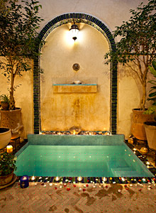 True to Moroccan tradition, Riad ZEN HOUSE is an earthly paradise where the elements harmonize with nature: water dripping from fountains, fire blazing in fireplaces, rich red earth in beautiful gardens, a roof-top patio connecting gentle desert winds and moon-lit nights to their reflection in the peaceful courtyard below. A magnificent olive tree, symbol of peace, protects this utterly ZEN HOUSE, a fascinating mixture of the Orient and Africa. Riad ZEN HOUSE is an exceptional private guesthouse located just inside the fortified walls of the Old City of Marrakech, the Medina. A true paradise on earth, ZEN HOUSE incarnates harmony between the elements : EARTH (gardens), WIND (open-roof patio), WATER (oriental baths, fountains, hamam) and FIRE (lanterns, candles, 3 fireplaces). ZEN HOUSE open onto the starlit-lit sky of Marrakech and snow-covered Atlas Mountains. Its atrium houses a family of birds. Its decoration and spirit symbolize the profound feeling of TRANQUILITY its name implies. Accommodation: 5 double guestrooms + additional futon accommodation (Sleeps 12 adults), 5 ensuite oriental baths, 1 living room, 3 fireplaces, 2 fountains, 2 gardens, 2 kitchens, 2 additional WC, 1 lanai dining room with fireplace, 1 solarium with outdoor BBQ, 1 dipping pool. Zen House is an unforgettable experience in the Art of Moroccan Hospitality!