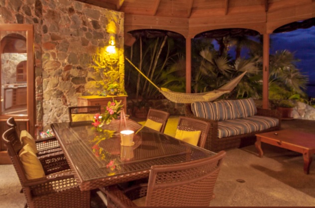 Leave your worries on the mainland. The Stonehouse has everything you need to vacation on St John. Built by legendary St. John builder Glen Speer, Stonehouse is a Coral Bay statement piece. Its elegant stone structure and beautiful landscaping provides the perfect backdrop for a true St. John getaway. The front of the home is graced with a large round rotunda that opens up to a stunning view of mature tropical gardens, Coral Bay harbour and beyond. An octagon pool mirrors the outdoor living space and offers guests endless hours of fun and relaxation in the tropical sun. The spacious Living Room has a ceiling fan, cable TV, DVD player, and a CD player with an Ipod dock. The stereo features indoor and outdoor speakers. Outdoor lighting on timers help make your evening arrivals easy. The fully equipped kitchen with granite countertops includes all the necessities like pots and pans, dishes, silverware, coffee-maker, blender, toaster, gas stove, oven, toaster-oven, microwave, dishwasher, full size refrigerator with freezer, and a washer and dryer. The dining area has seating for six including place mats and candlesticks. Stonehouse is a two bedroom villa which can sleep 4 guests. The First Master Bedroom boasts a beautiful iron king-size four-poster bed, air conditioner, ceiling fan, alarm clock, private flower covered terrace, private bathroom with open stone shower. The first master bedroom faces the water with three beautiful arched windows to drink in the sunrise. The Second Master Bedroom has a king bed, air conditioner, ceiling fan, dresser, built-in bookcase, a private patio seating area, and a private bathroom with open stone shower. The second Master Bedroom faces the water with three stone arched windows. All linens and towels are provided. The stunning rotunda provides shelter from the sun and a breezy place to lounge on two wicker sofas or the hammock. The rotunda features a gas grill, two ceiling fans, outdoor lighting and speakers. Outdoor chaise lounge chairs and a dining table and chairs surround the sparkling pool which is maintained by pool care company. There is also an outdoor bathroom with shower. Beach chairs, coolers and beach towels available for guest use.